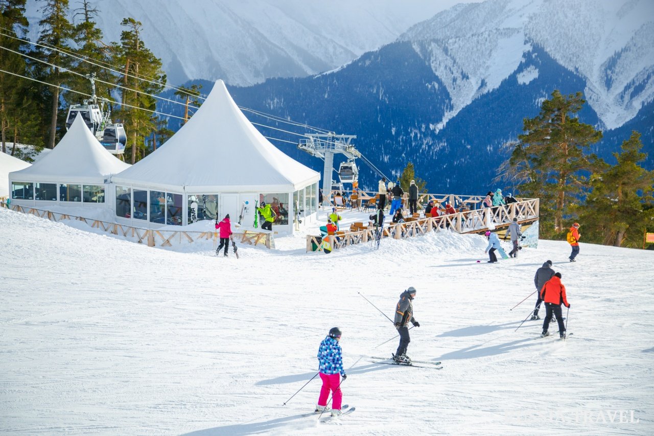 В Архызе под горнолыжные трассы обустроены 2 склона: хребет Габулу и хребет Абишира-Ахуба. В народе их называют Северный и Южный склон. Зона катания расположена на высоте 1650-2500 м. Здесь очень приятно кататься как по открытым горным участкам, так и по пихтовому лесу. Курорт украшают десятки кафешек, вокруг звучит музыка. Одним словом, курорт Архыз – это сейчас один из самых комфортных мест отдыха на Кавказе.